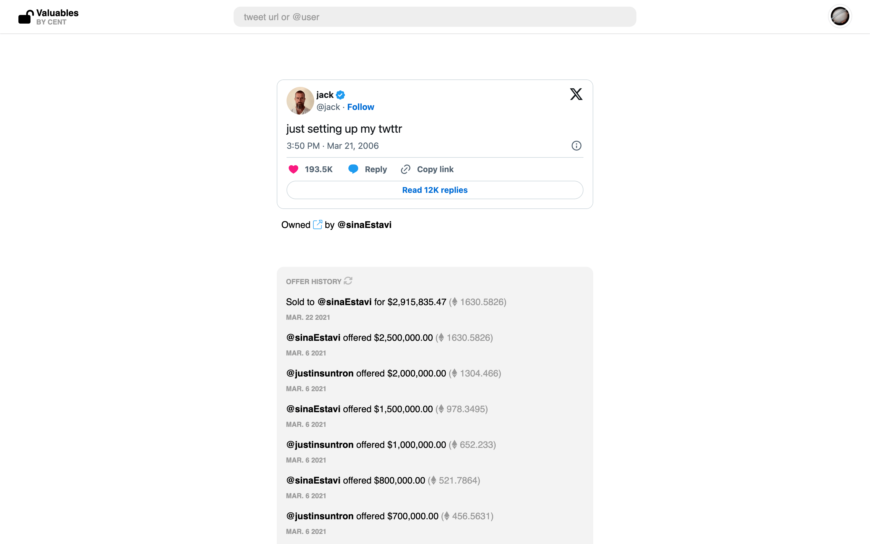 The Valuables website was an experiment launched by Cent in monetizing existing social content through NFTs. On the site, anybody with a twitter account was able to mint their own tweets for free and place offers on other creator's tweets. The platform gained attention in March, 2021 when Twitter founder Jack Dorsey sold the first-ever tweet on Valuables.
